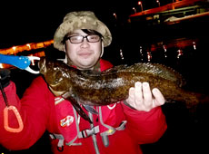 2.5gのジグヘッドでボトム付近をスイミングさせ、何か硬い物にヒットした瞬間に「モゾッ」としたバイト!フッキングするとロッドがぶち曲がり!タモ入れしてもらい無事キャッチ!ヒットしたのは51cmのアブラコ(アイナメ)!