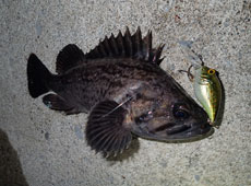「そろそろ良い時間だ!」とトップウォータープラグをキャストしたなかじーにクロソイがヒット!