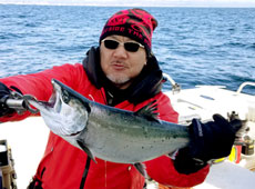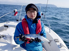 サクラマスを狙い函館近郊のオフショアへ。 開始まもなくからホッケのヒットがポツポツと続く状況。 しかし、なかなかサクラマスの姿が見えず苦戦する状況の中、たじま君が本命のサクラマスをキャッチ!