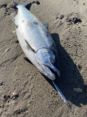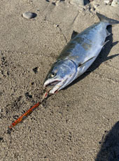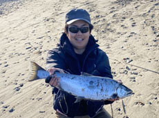 日本海側のサーフでサクラマスを狙いました!夜明けとともに釣り開始!しばらくすると、周りのアングラーたちが続々とサクラマスをヒットし始め、期待十分!岡ジグLT‐35のスローリトリーブで狙っていると波打ち際で待望のヒット!キャッチしたのは51cmのサクラマス!