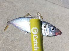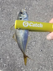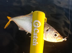 1.5gジグヘッドリグてスタート。 ボトムを中心に早めのアクションで狙うと、15cmほどのアジがコンスタントにヒット!