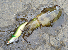 堤防先端のテトラが絡む場所の沖目にキャストしてボトムから探ってくると沖目でヒット!久々のアオリイカの引きを堪能しながら慎重に寄せて無事キャッチ!
