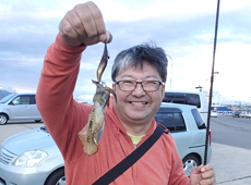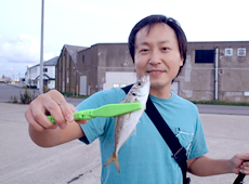 アジング初挑戦の杉本さんがいち早くアジをゲット!函館港のアジの方がサイズが良いですね!