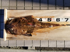 恵山沖にてマダラを狙っていたところ、ボトム付近でスロージャークしていたメタルジグに「ズシン」とヒット!重量感のあるファイトにデカいタラ?と期待が膨らむ。上がってきたのは何と!今までに見たのとの無いくらい大きいカジカ!