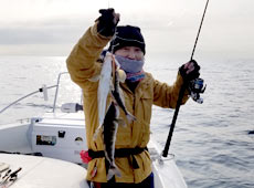 ホッケの猛攻を交わしつつメバルのヒットを重ねていると、会田さんに重量感のある魚がヒット! 水面に上がってきたのは70cmほどのマダラ!