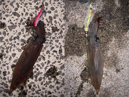 この日はあまり反応が良くなかったそうで、買ったばかりのラトル入りのエギを使ったところ、回りで誰も釣れていない所でいきなりヒットしたそうです!色やサイズのローテーションだけでなく、ラトル音も重要になってきそうですね!エギングは奥が深い!