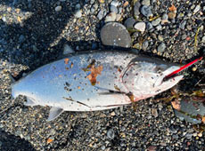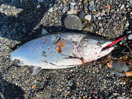 明らかに朝に釣り上げた物よりも大物の手ごたえ!上がってきたのは59cm、3.12kgのサクラマスでした。