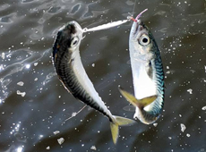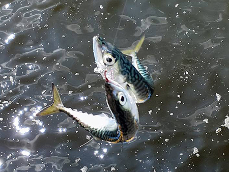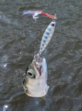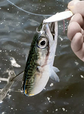 ポイントに到着すると、25cmほどのサバがコンスタントにヒットしている状況! ライトタックルに10gのメタルジグをセットし沖目へキャスト! さっそくフォール中に「ゴツゴツ」げと活性の高いサバがルアーに向かって頻繁にアタック! ヒットしてからはサバ特有の力強い横走りファイトを楽しませてくれました! 一度に2匹同時ヒットも何度かありました! 短時間勝負でしたが元気なサバのファイトに癒され楽しみました