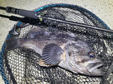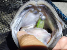 BRS-S74L-LGにジャッカル・リズムウェーブ3.8インチ+3.5gのジグヘッドをセットして表層〜中層をスイミングさせてくると鋭いバイトが!中々に強い引きで上がってきたのは40cm近い良型クロソイ!
