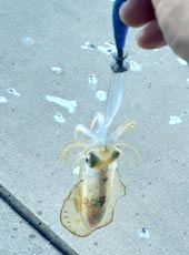 次のポイントはアマモが群生し、潮通しの良い期待のエリア。 ワクワクしながらポイントへエギをキャストすると、さっそく1投目からアオリイカの反応! フォール中にラインがスーッと走りフッキング!キャッチしたのは1杯目と同サイズのアオリイカでした。