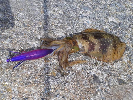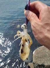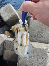 津軽海峡方面の漁港でアオリイカを狙いました。 漁港の船道付近に2.5号のエギをキャスト! 表層付近に小型のベイトが多く確認できたため、同じ層を探ってみました。 すると、さっそくアオリイカの反応があり、フォール中にヒット! 小型でしたがうれしい今季初物をキャッチ!