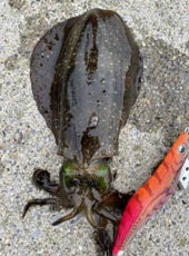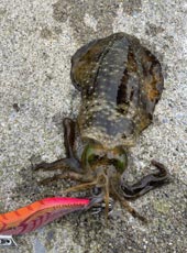 潮止まりでピタッと反応が止まり、見えイカもエギを無視するようになったのを確認し、8:30に釣行終了。結果110〜160gのアオリイカが12杯ゲットでした。