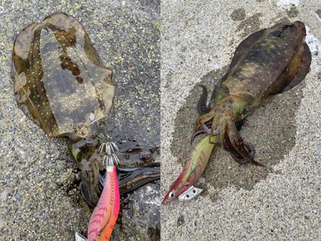 今回は、フォールスピードが早めのエギのカーブフォールが反応良く、同じエギでもフリーフォールには反応なし、フォールスピードが遅いエギでも反応なし、とフォールパターンでも明確に反応に変化がありました。