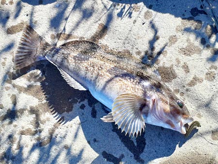 14gフリーリグをセットし広範囲を狙う作戦。 ショートバイトが多く苦戦しながらも何とかヒットに持ち込んだのは本命のアブラコ(アイナメ)! 久しぶりの魚のため、慎重にタモ入れしキャッチ。