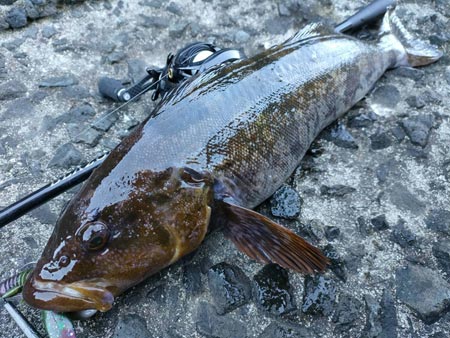 サイズ狙いでボリュームのあるワームに14gのスティックシンカーを合わせて、シャッドテール系ワームのスイミングやホッグ系ワームのボトムバンプでの釣果!50cmに僅か届かなかったが、 アタリは「ガツッ」と来る元気な個体ばかりで、この日は合計5匹のアブラコ(アイナメ)が釣れたとのこと。