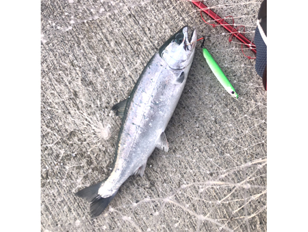 夜明けとともに釣りスタート。 日が昇ってきてからはサクラマスの跳ねが見え始め、チャンスタイムに突入。 メタルジグをカラーローテーションしながらタダ巻きアクションで狙いました。 沖目は潮の流れが良く、釣れそうな雰囲気が漂う中待望のヒット!