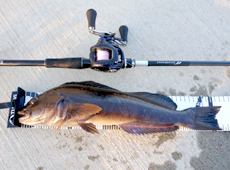 手前のストラクチャーに対して、遠めにキャストして奥から近づけていくイメージでリフト&フォール。ストラクチャーの際に擦れた辺りでゴツンとバイト!フッキングしつつ即リフトしてランディング成功!