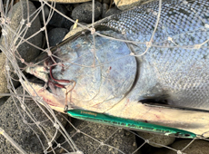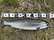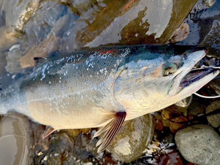 仕事帰の夕マズメ狙いで噴火湾方面へ向かった”ぼん茶さん”周囲には3人のサクラマス狙いのアングラーの姿がありましたが、反応が無いのかいつの間にか自分一人に・・・それでもあきらめずにキャストを続けた約1時間後にモジリを発見!すかさずジグをキャストするとその4投目で待望のヒット!「ドスン」とした強烈な手ごたえの後にドラグ音が鳴り響き、良型サクラと確信!暴れる魚としばらく格闘し、なんとかネットイン!61cm、3kgジャストのサクラマスをゲットしたそうです。
