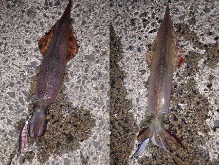 3月30日、日本海方面の漁港をランガンして良型ヤリイカを釣り上げた新井田さんから釣果写真が届きました。