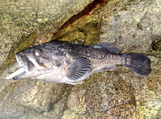 95mmのシンキングペンシルをセットし、沖に点在している岩礁帯へキャスト。 ボトム付近をリフト&フォールで狙っているとさっそく反応がありヒット! 重量感のある魚の正体はターゲットのクロソイ!40cmを超えるナイスサイズ!