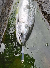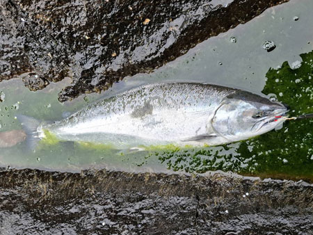 それでも諦めずにキャストを続けていると待望のヒット!久々のサクラマスのため、バラさないように慎重にファイト。無事タモに収まりランディングしたのは58cm、2.48kgと納得のサイズ! この1匹で十分満足し終了しました。