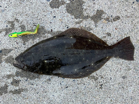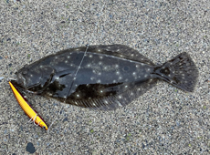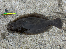 この日、黒田さんは早朝からサクラマスを狙ってサーフへ向かいました。 しかし、天気予報で確認した以上に天候が悪く、港内でヒラメ狙いに変更。 ジャクソン・クイックセットをキャストして探ること3投目でなんと幸先よくヒラメがヒット! 今季初ヒラメは47cmと上々のスタートを切りました。