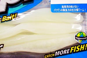 湾奥の激スレフィールドや潮の止まった時間帯でもシーバスをバイトに持ち込めるファイナルウェポン。 ガルプ!の400倍で拡散する味と匂いでシーバスにスイッチを入れる事が可能。ストレートリトリーブで僅かにアクションするツインテールは強い波動にスレたシーバスに抜群の効果を発揮。